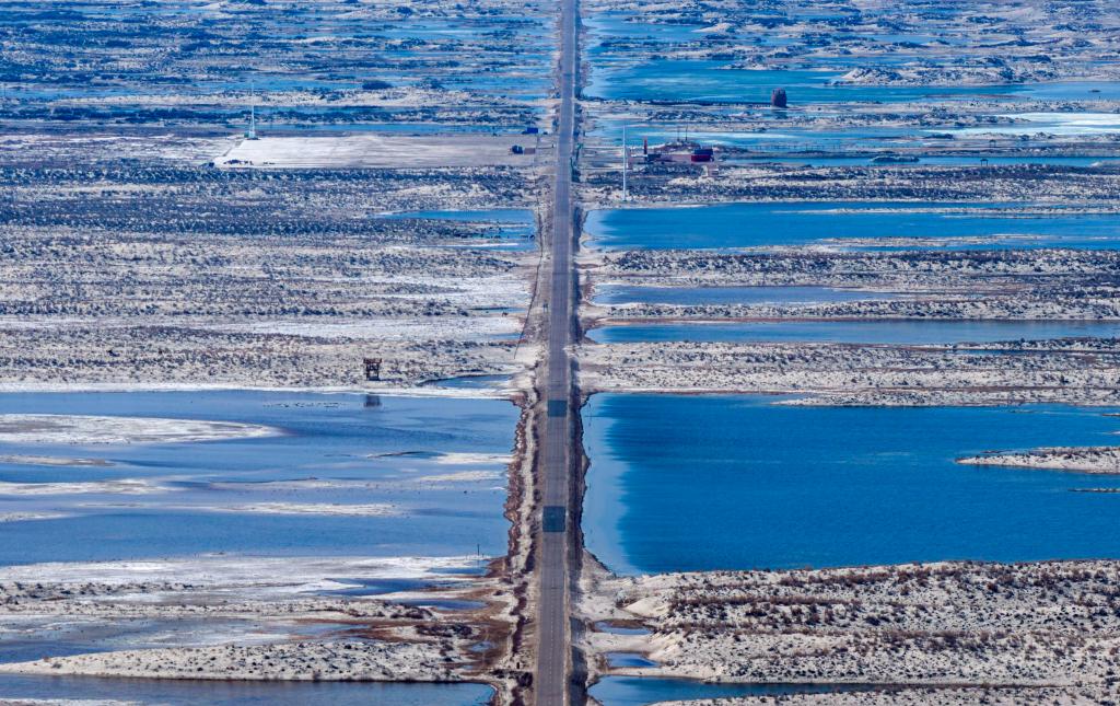 1日、新疆ウイグル自治区アルタイ地区福海県のウルングル湖国家湿地公園に延びる高圧送電線。(ドローンから、ウルムチ=新華社配信)
