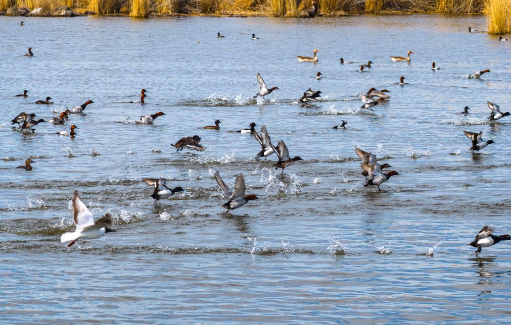1日、新疆ウイグル自治区アルタイ地区福海県のウルングル湖国家湿地公園で水と戯れる渡り鳥。(ウルムチ=新華社配信)