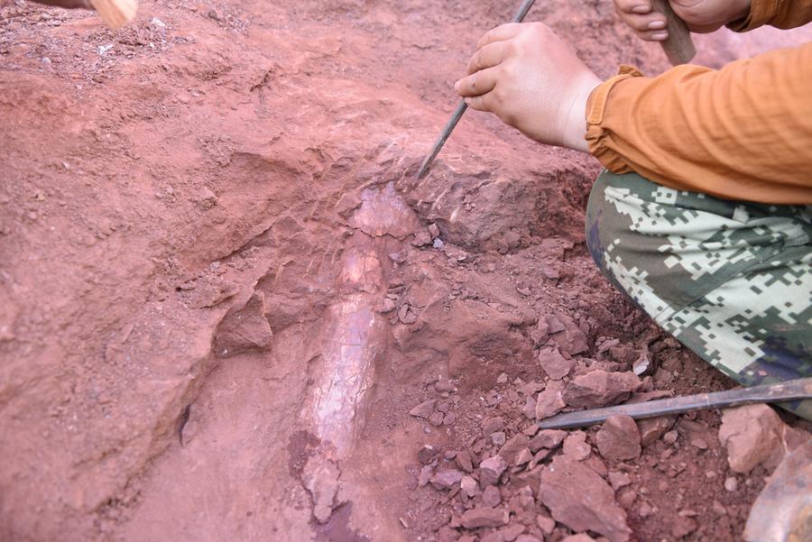 帆尾貢水竜の露出した四肢骨の化石。(贛州=新華社配信)