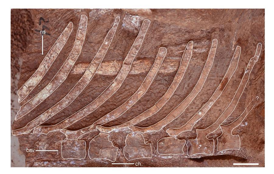 後部尾椎の神経棘が伸長して形成された帆尾貢水竜の「帆状の尾」。(贛州=新華社配信)