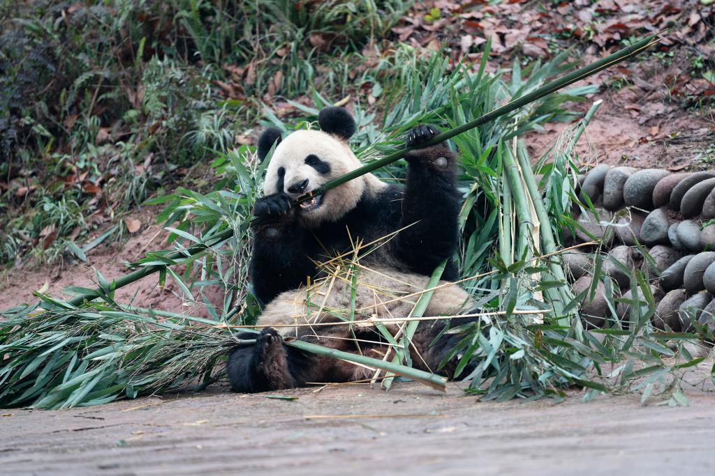 竹を食べるシンシン。(1月30日撮影、雅安=新華社配信/Panda365提供)