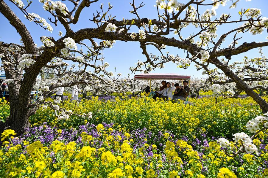 6日、河北省晋州市の梨畑で花を楽しむ観光客。(晋州=新華社配信/梁子棟)