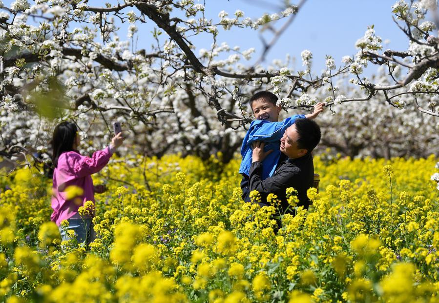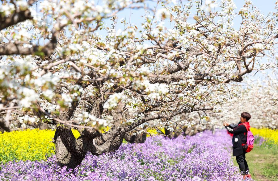 6日、河北省晋州市の梨畑で花を楽しむ観光客。(晋州=新華社配信/張暁峰)