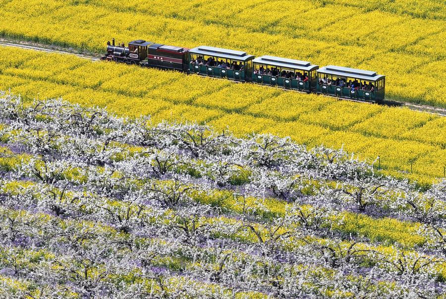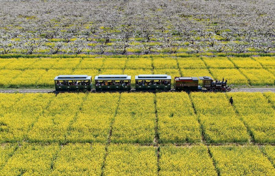 【新華社晋州4月10日】中国河北省晋州市で17万ムー(約1万1300ヘクタール)にわたり梨の花が咲き、満開となった菜の花畑と鮮やかなコントラストを成している。