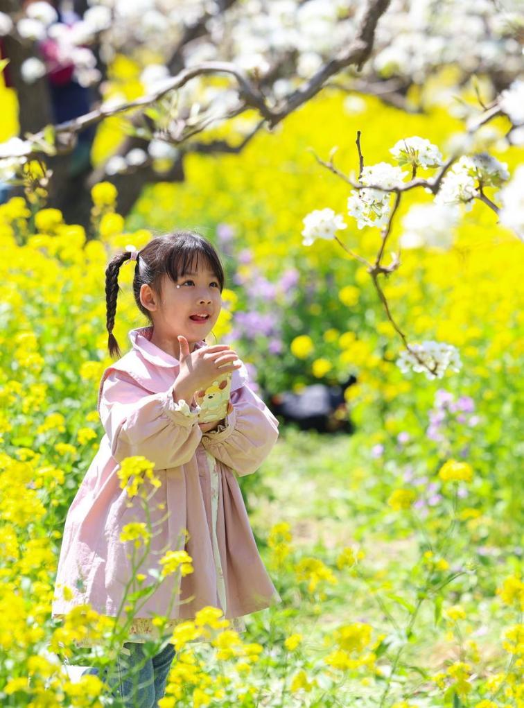 6日、河北省晋州市の梨畑で花を楽しむ子ども。(晋州=新華社配信/梁子棟)