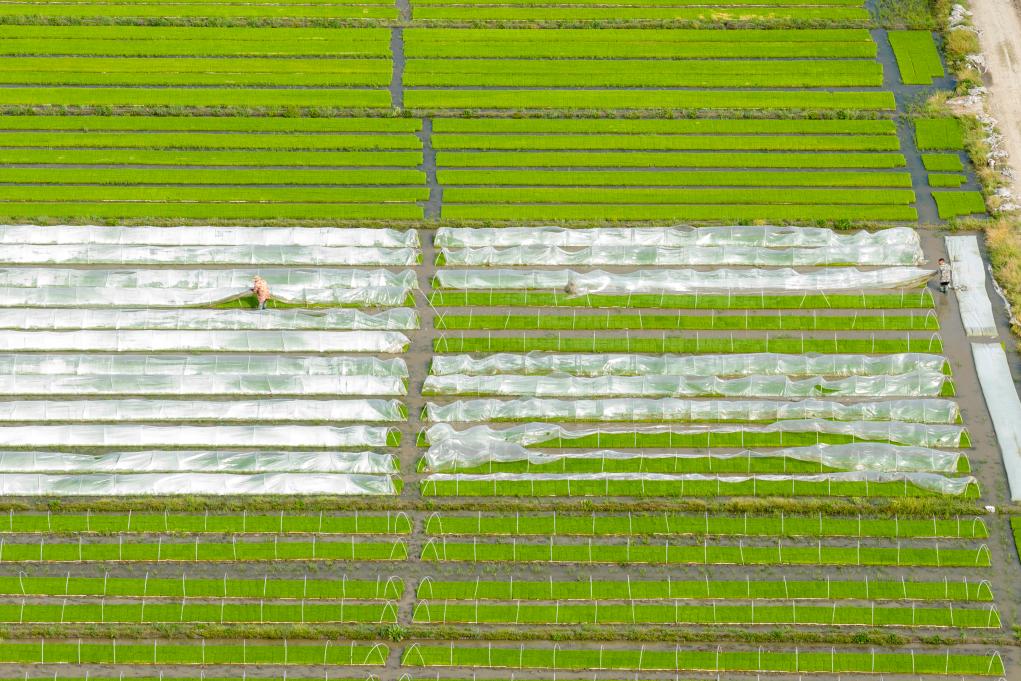 7日、浙江省余姚市で農作業をする人。(ドローンから、余姚=新華社配信/張輝)