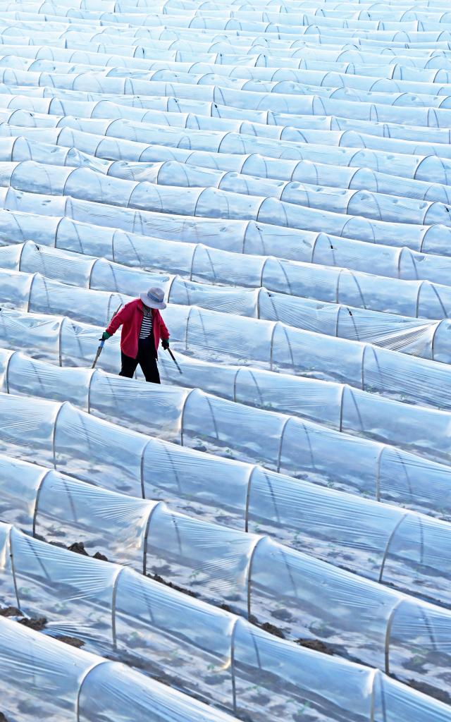 5日、河南省孟州市にあるスイカ畑で、ビニールトンネルに換気穴を開ける農家の人。(孟州=新華社配信/白水平)