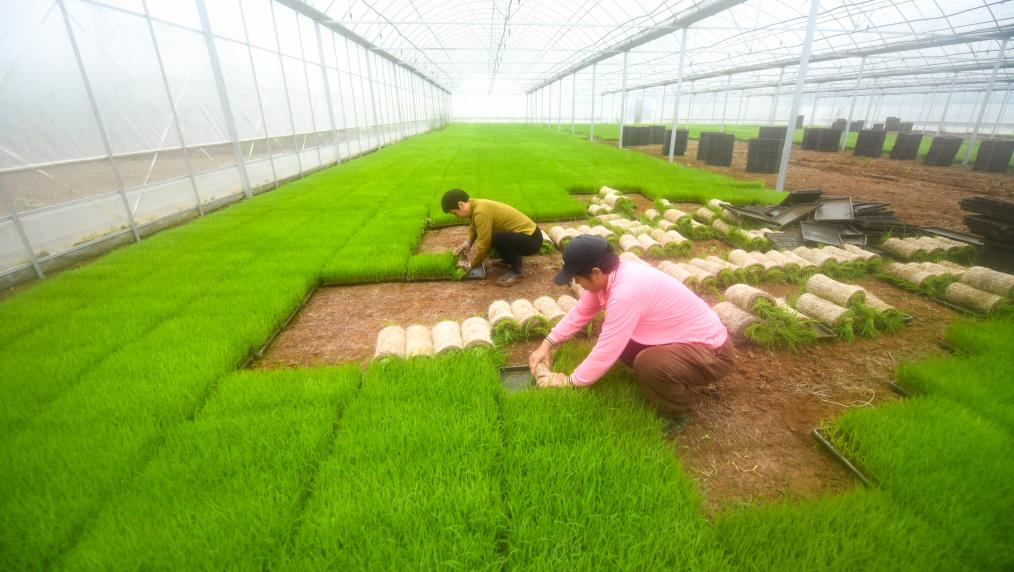 6日、河南省信陽市光山県にある青竜河合作社(協同組合)の全自動スマート育苗場で稲の苗を管理するスタッフ。(信陽=新華社配信/謝万柏)