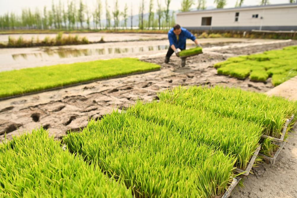 7日、湖南省常寧市官嶺鎮で稲の苗を育てる農家の人。(常寧=新華社配信/周秀魚春)