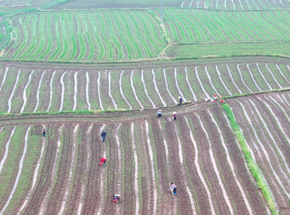 7日、湖南省衡陽市衡東県で農作業をする人々。(ドローンから、衡陽=新華社配信/曹正平)