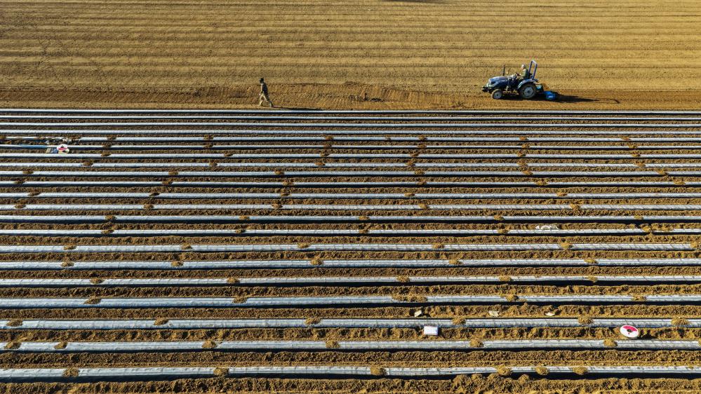 7日、河南省開封市鼓楼区でサツマイモの苗をシートで被う農家の人。(開封=新華社配信/李俊生)