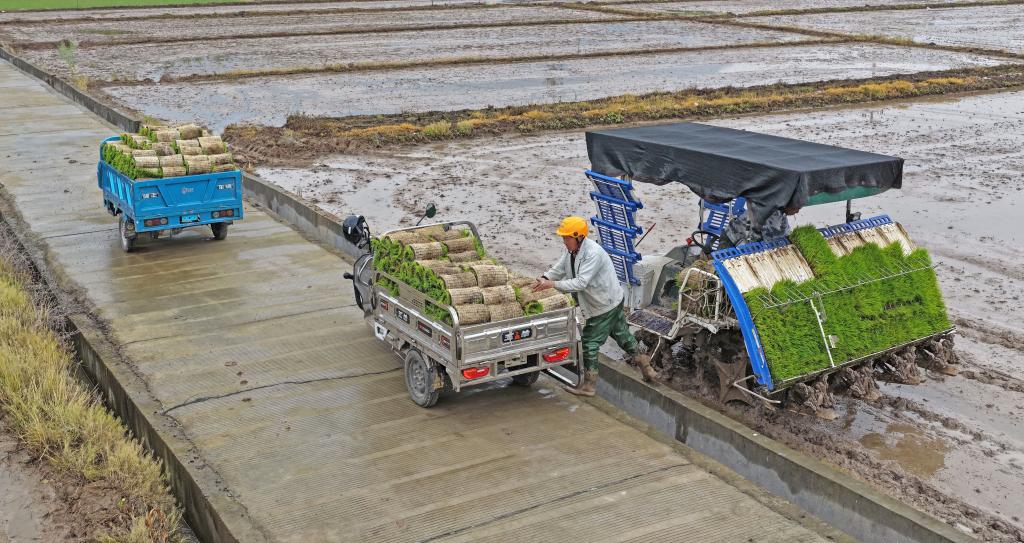 7日、浙江省台州市仙居県で、田植え機に苗を置く農家の人。(ドローンから、台州=新華社配信/王華斌)