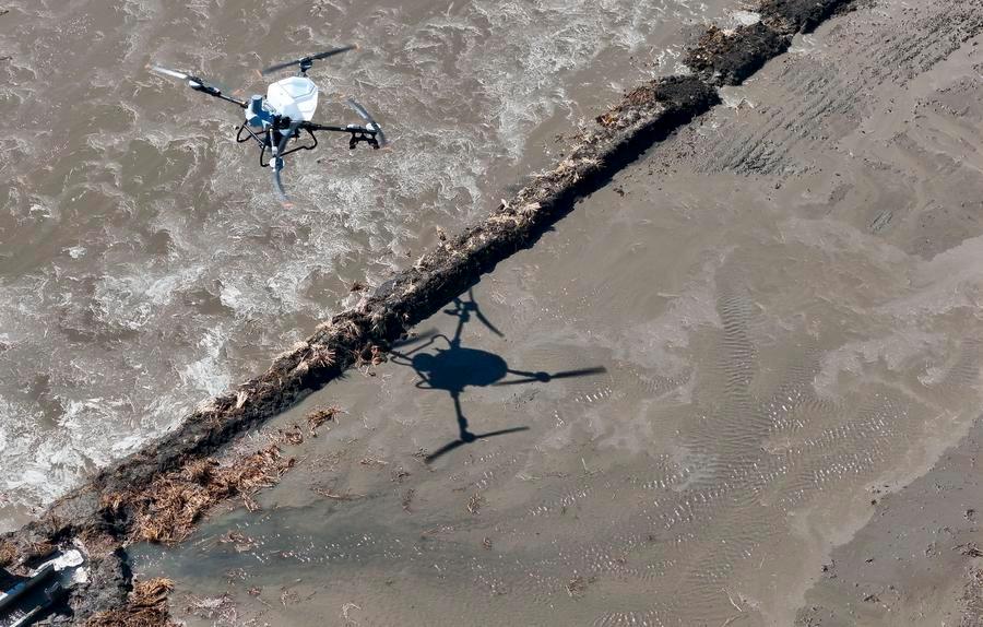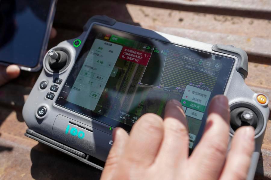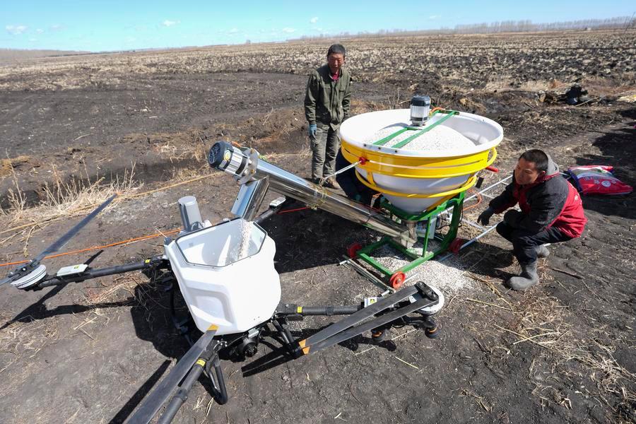 9日、黒竜江省の農業企業、黒竜江北大荒農業の友誼分公司第9管理区で、農業用ドローンを使って肥料を散布する農家の人。(双鴨山=新華社記者/王松)