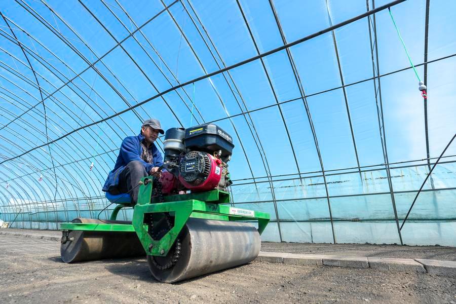 9日、黒竜江省の農業企業、黒竜江北大荒農業の友誼分公司第3管理区の水稲育苗ハウスで、苗床を整える農家の人。(双鴨山=新華社記者/王松)
