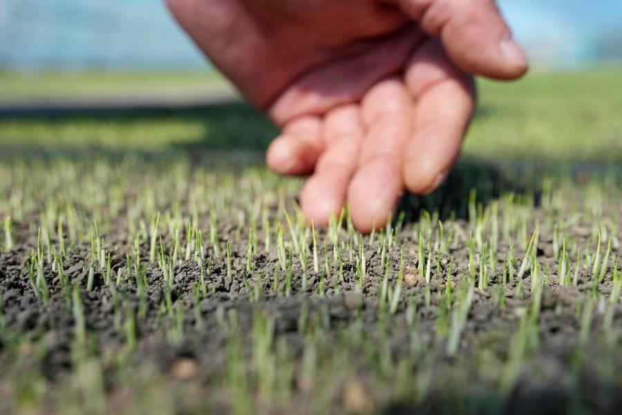 9日、黒竜江省の農業企業、黒竜江北大荒農業の友誼分公司第3管理区の水稲育苗ハウスで、苗の成長状態を確認する農家の人。(双鴨山=新華社記者/王松)