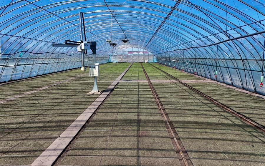 9日、黒竜江省の農業企業、黒竜江北大荒農業の友誼分公司第3管理区の水稲育苗ハウス。(ドローンから、双鴨山=新華社記者/王松)