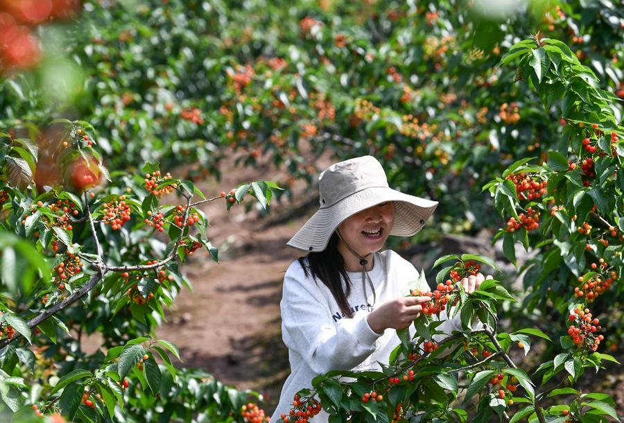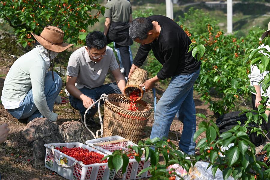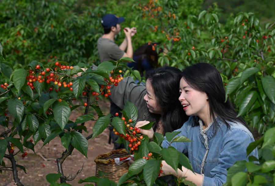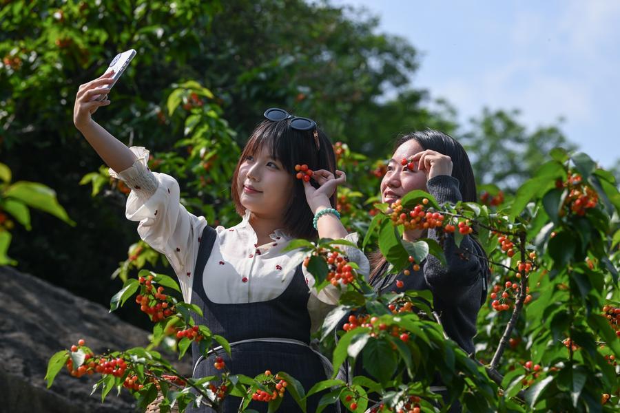 9日、重慶市璧山区の雲霧山桜桃谷でサクランボ狩りを楽しむ観光客。(重慶=新華社記者/陳誠)