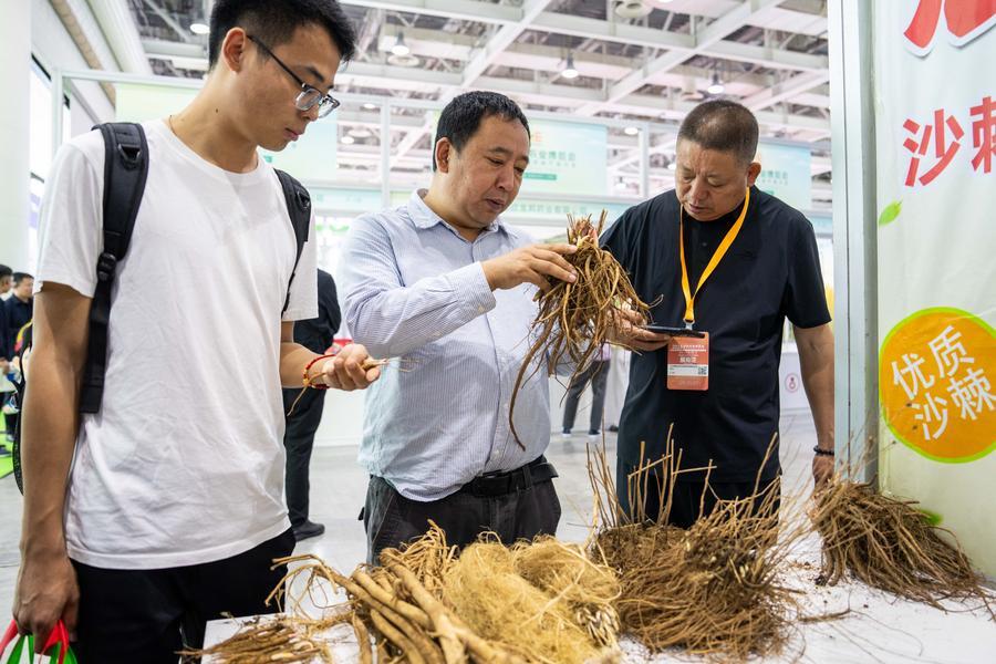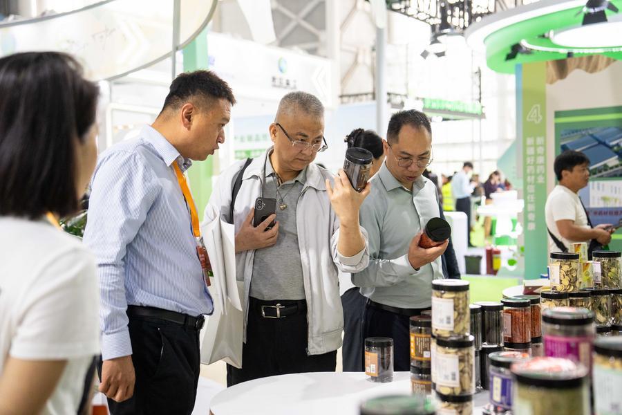 10日、第1回中医薬農業博覧会で、中医薬材の品質を確認する人(中央)。(長沙=新華社記者/陳思汗)