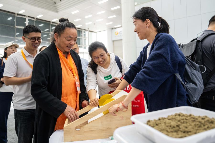 10日、第1回中医薬農業博覧会で、製品を手に取る人。(長沙=新華社記者/陳思汗)