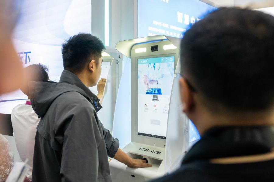 10日、第1回中医薬農業博覧会で、スマート健康診断機を試す人。(長沙=新華社記者/陳思汗)