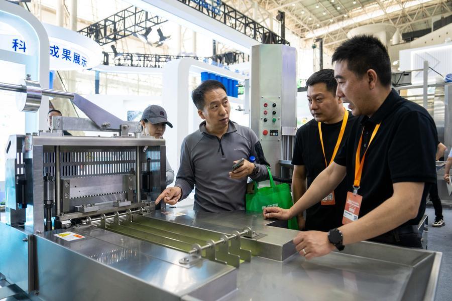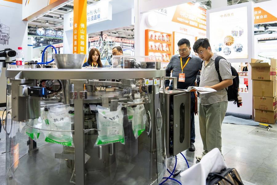 10日、第1回中医薬農業博覧会で、自動薬品包装設備の説明を聞く人(右端)。(長沙=新華社記者/陳思汗)