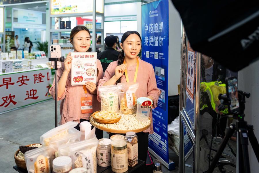 10日、第1回中医薬農業博覧会で、健康食品をライブ配信で販売する出展者。(長沙=新華社記者/陳思汗)