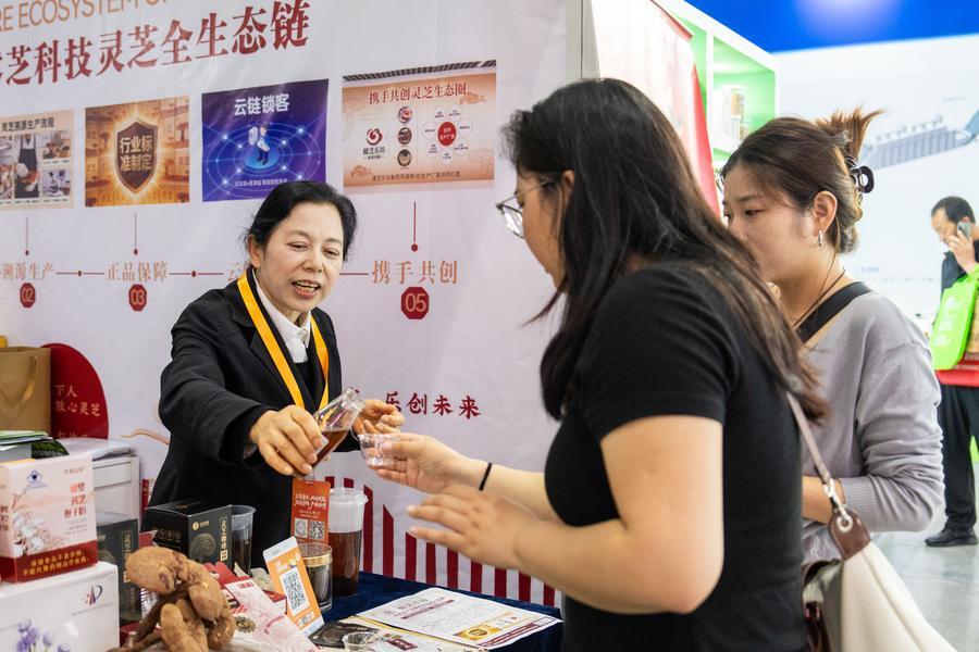 10日、第1回中医薬農業博覧会で、来場者に霊芝(れいし)ドリングを紹介する出展者(左端)。(長沙=新華社記者/陳思汗)