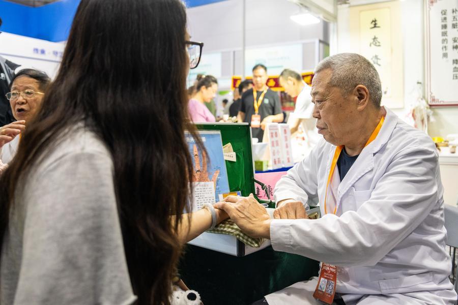 10日、第1回中医薬農業博覧会で、来場者に脈診を行う医師(右)。(長沙=新華社記者/陳思汗)