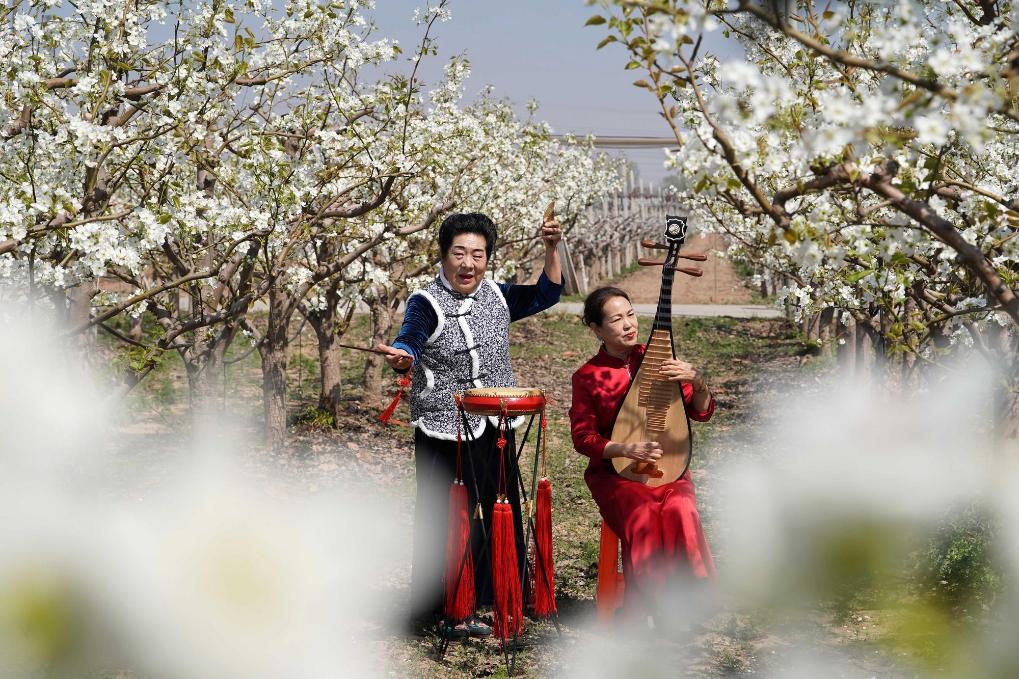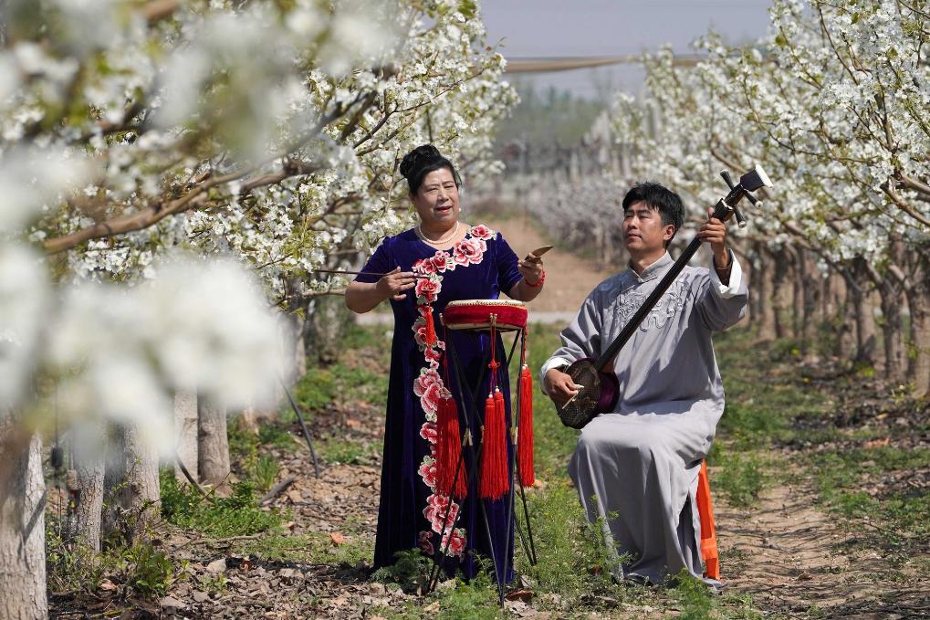 4日、威県袁荘村のナシ園で国家級無形文化遺産「梨花大鼓」を披露する民間芸人。(邢台=新華社配信/陳雷)