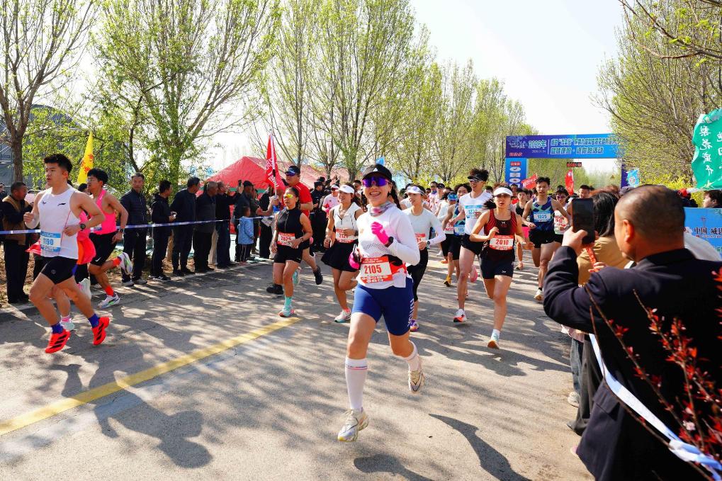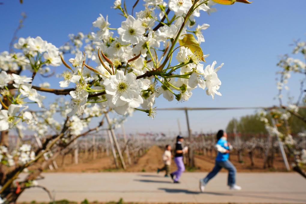 4日、威県袁荘村のナシ園でランニングを楽しむ愛好者。(邢台=新華社配信/陳雷)