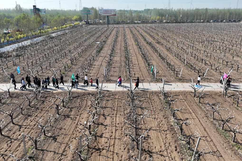 4日、威県袁荘村のナシ園でランニングを楽しむ愛好者。(ドローンから、邢台=新華社配信/陳雷)