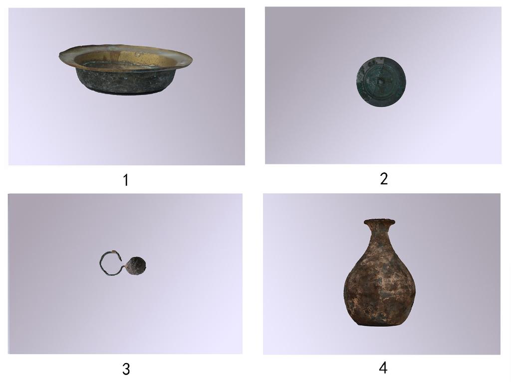 劉従吉墓出土の銅盆、銅鏡、銅鈴、錫壺などの金属器。(資料写真、大同=新華社配信)