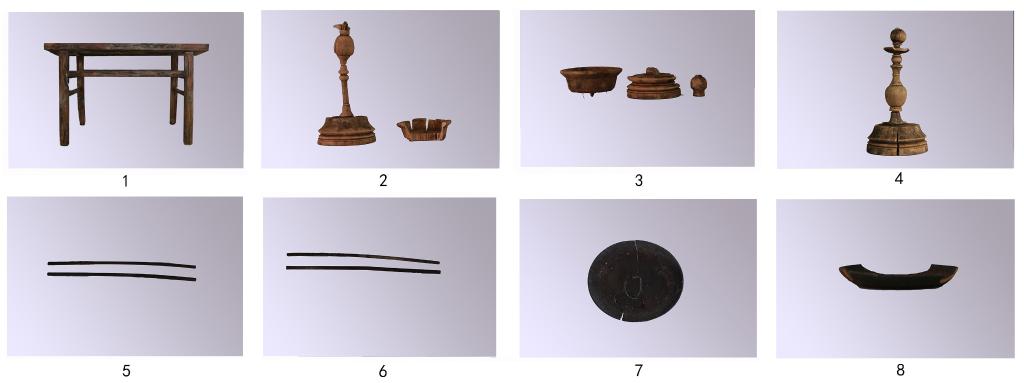 墓からは副葬品50点(組)が出土した。木製品が中心で、磁器や銅器、織物なども少量が含まれた。中でも供物台に置かれた燭台3点、箸2膳、皿2枚、くし、化粧箱各1点、磁器杯2点が注目を集め、400年以上前の生活シーンを再現していた。
