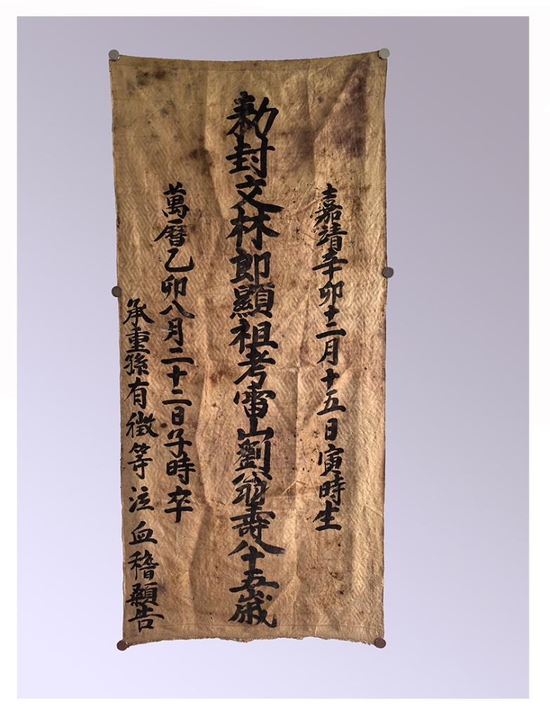 出土した墓銘磚、銘旌(めいせい=故人の姓名・官位などを記した旗)、ひつぎを覆う布から、被葬者が明文林郎韓城尹劉翁と妻の許氏だと分かった。生年は明の嘉靖10(1531)年12月15日、没年は万暦43(1615)年8月22日で享年85歳。ひ孫が埋葬した。文林郎は正七品(知県など)の位階、韓城尹の尹は知県の雅称を意味する。