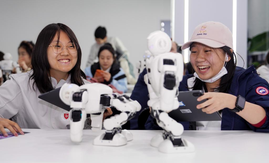 9日、石景山区の人型ロボットデータトレーニングセンターで小型ロボットを操作する子どもたち。(北京=新華社配信/靳晶)
