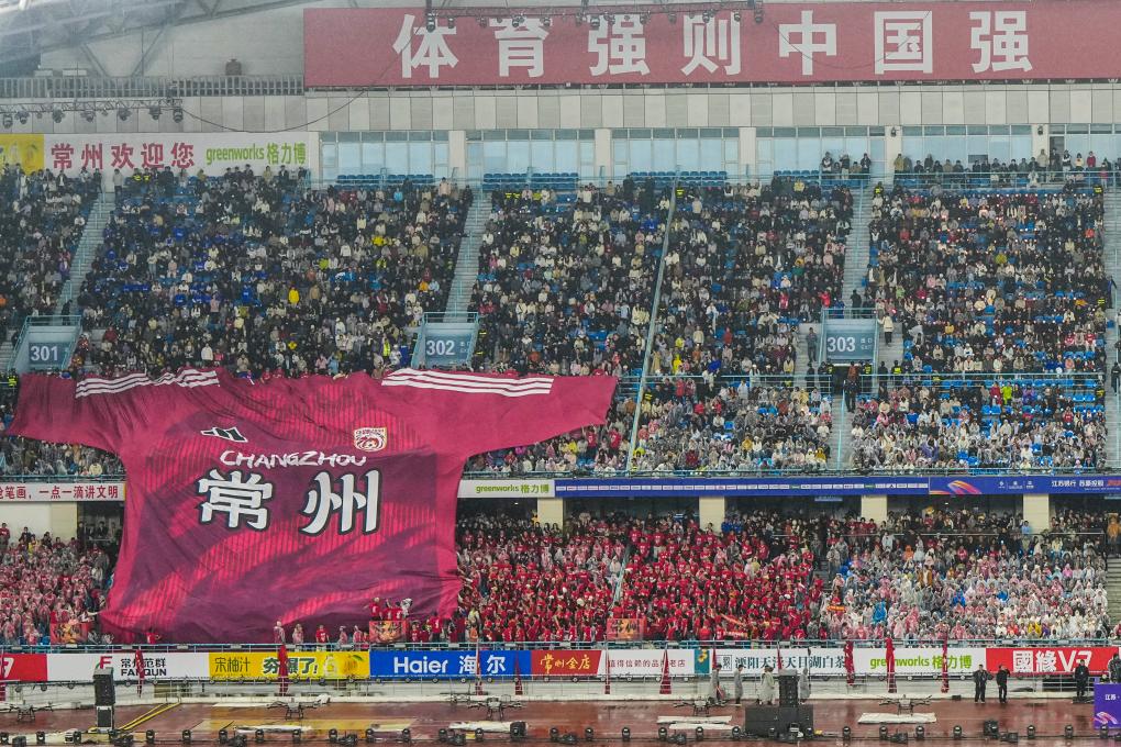 11日、スタンドで常州チームの巨大なユニフォームを掲げ応援するサポーター。(常州=新華社記者/李博)