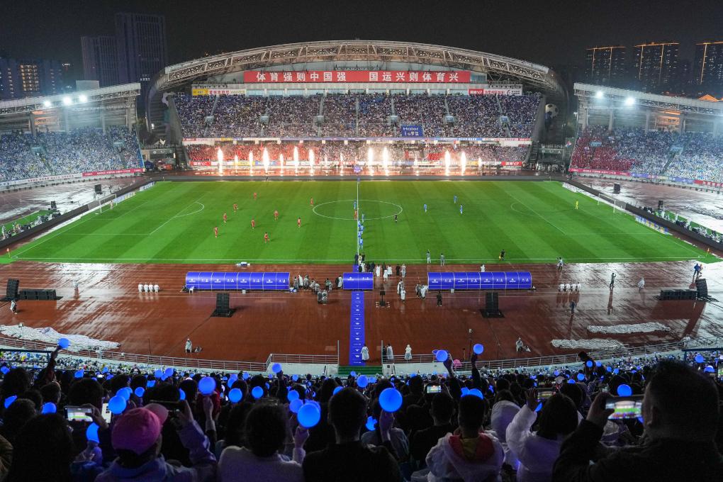 11日、キックオフの準備をする両チームの選手。(常州=新華社記者/李博)
