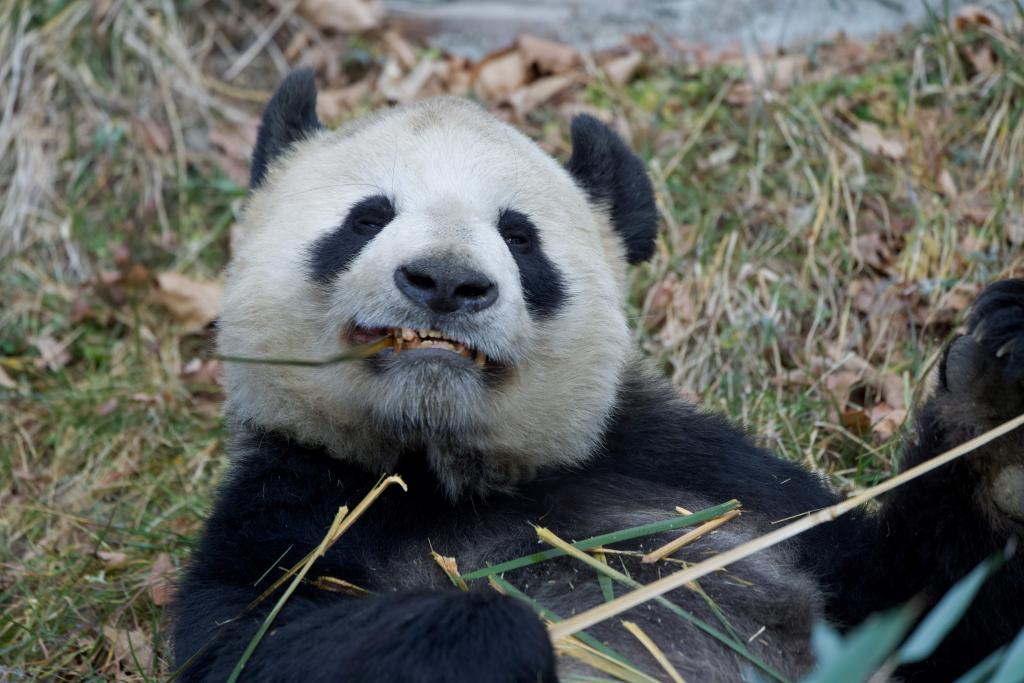 竹をよく噛んで食べるリーリー。(2月1日撮影、成都=新華社配信/Panda365提供)