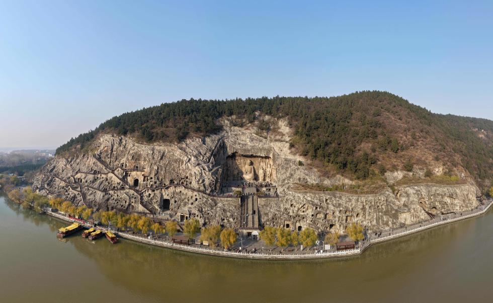 河南省洛陽市の竜門石窟風景区。(2025年12月5日、ドローンから、鄭州=新華社記者/李嘉南)