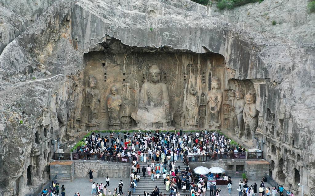 河南省洛陽市の竜門石窟風景区を訪れた人たち。(2025年4月24日、ドローンから、鄭州=新華社記者/李嘉南)