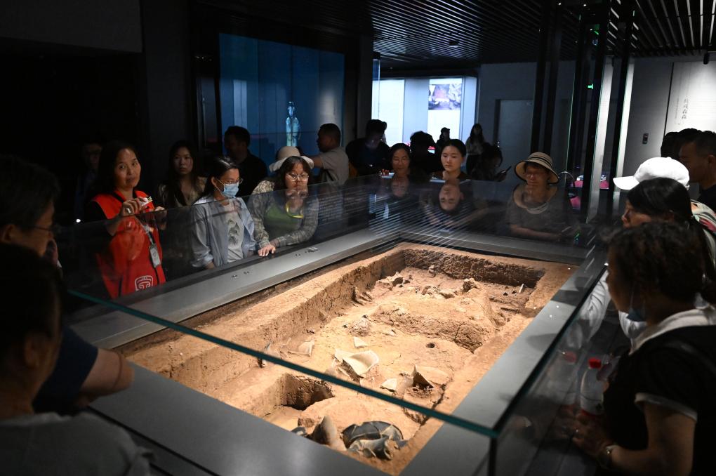 河南省洛陽市偃師区の二里頭夏都遺跡博物館で展示を見る人たち。(2025年4月16日撮影、鄭州=新華社記者/李嘉南)
