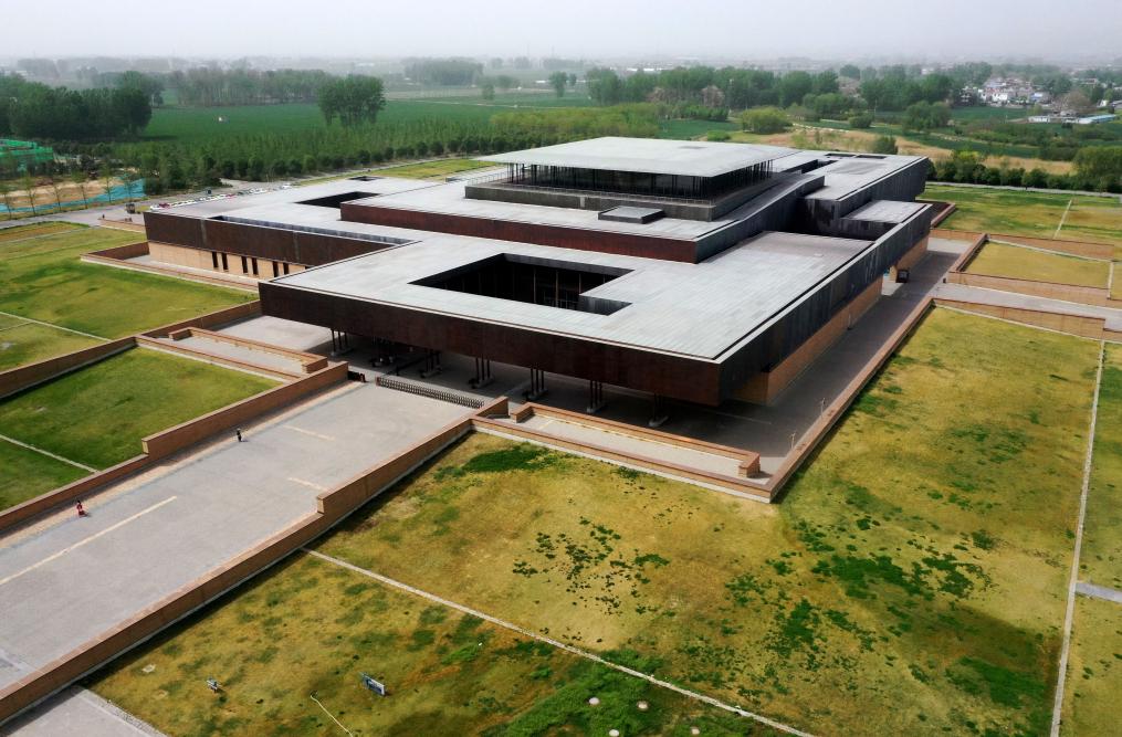 河南省洛陽市偃師区の二里頭夏都遺跡博物館。(2025年4月16日、ドローンから、鄭州=新華社記者/李嘉南)