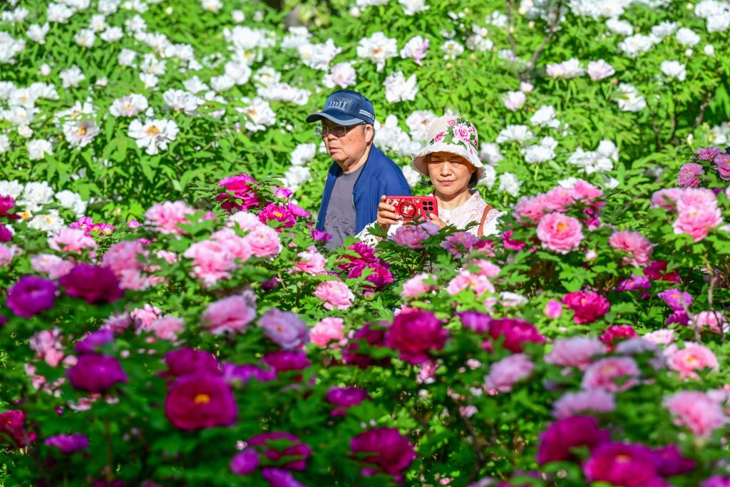 4日、河南省洛陽市の隋唐城遺跡植物園で花を観賞する人。(鄭州=新華社配信/李衛超)