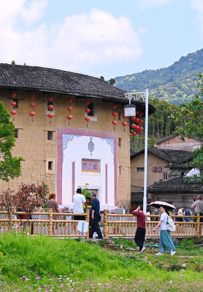 10日、福建省漳州市華安県にある二宜楼を見学する観光客。(福州=新華社記者/林善伝)