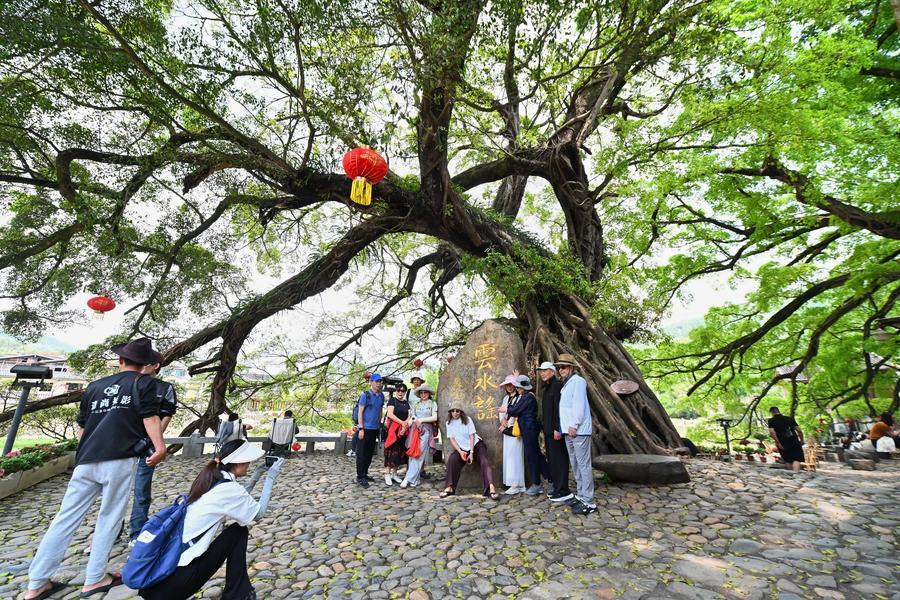 9日、福建省漳州市南靖県の雲水謡古鎮にあるガジュマルの下で写真を撮る観光客。(福州=新華社記者/林善伝)