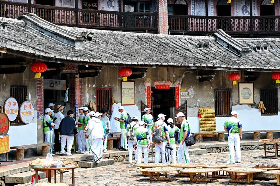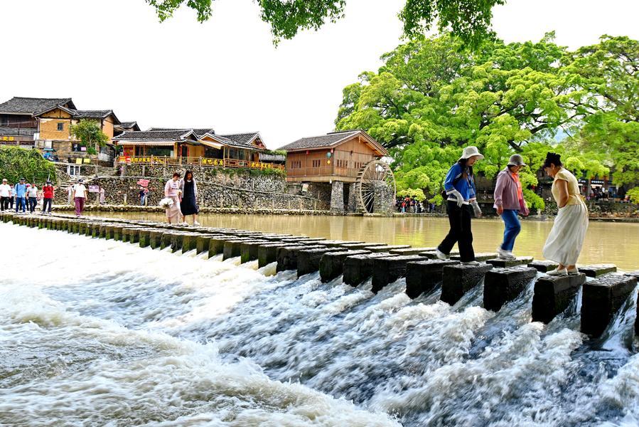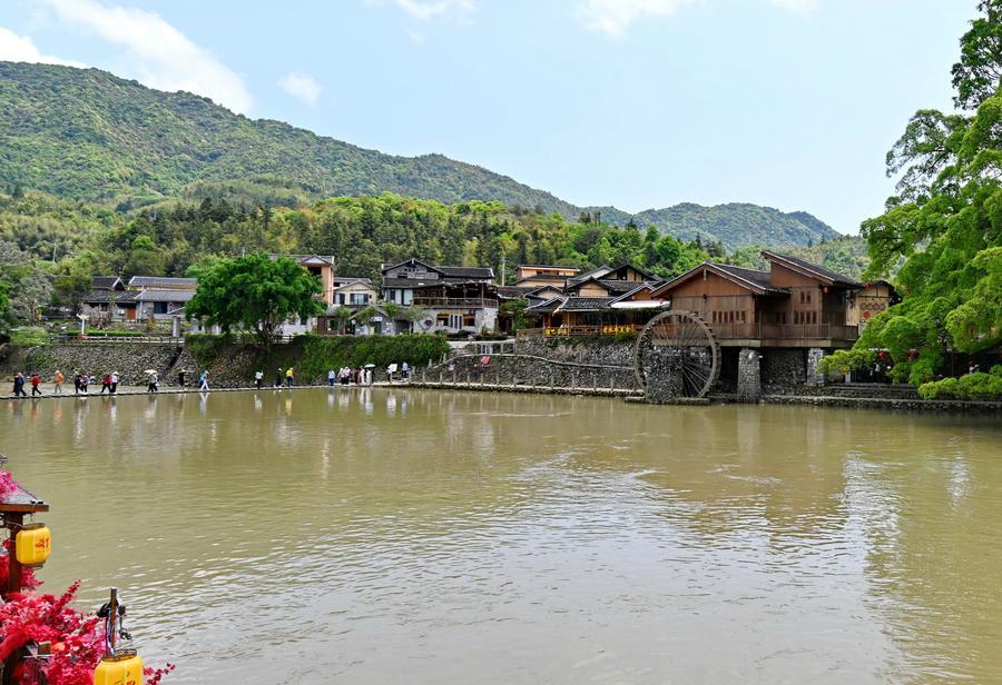 9日、福建省漳州市南靖県の雲水謡古鎮を散策する観光客。(福州=新華社記者/林善伝)
