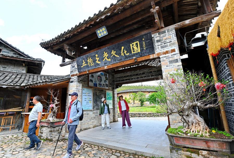 9日、福建土楼(南靖)風景区の「土楼之光文化園」を見学する観光客。(福州=新華社記者/林善伝)