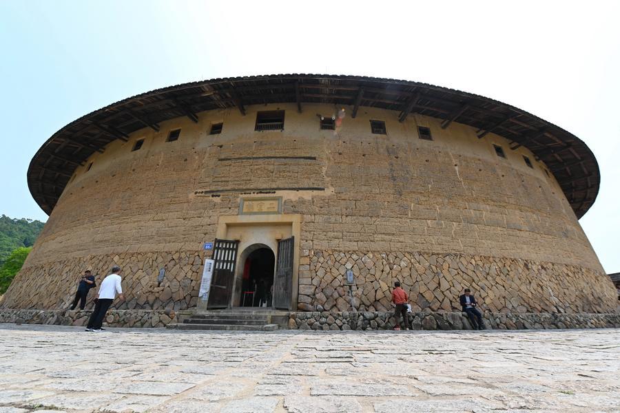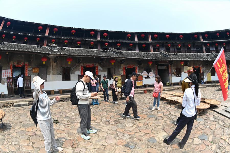 9日、福建省漳州市南靖県にある懐遠楼を見学する観光客。(福州=新華社記者/林善伝)