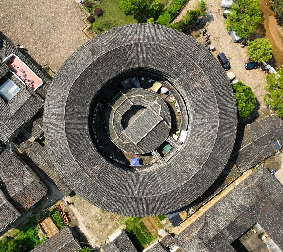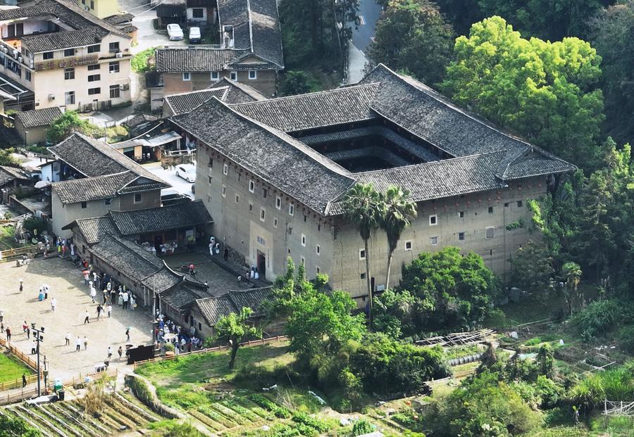 10日、福建省漳州市華安県にある二宜楼。(ドローンから、福州=新華社記者/林善伝)