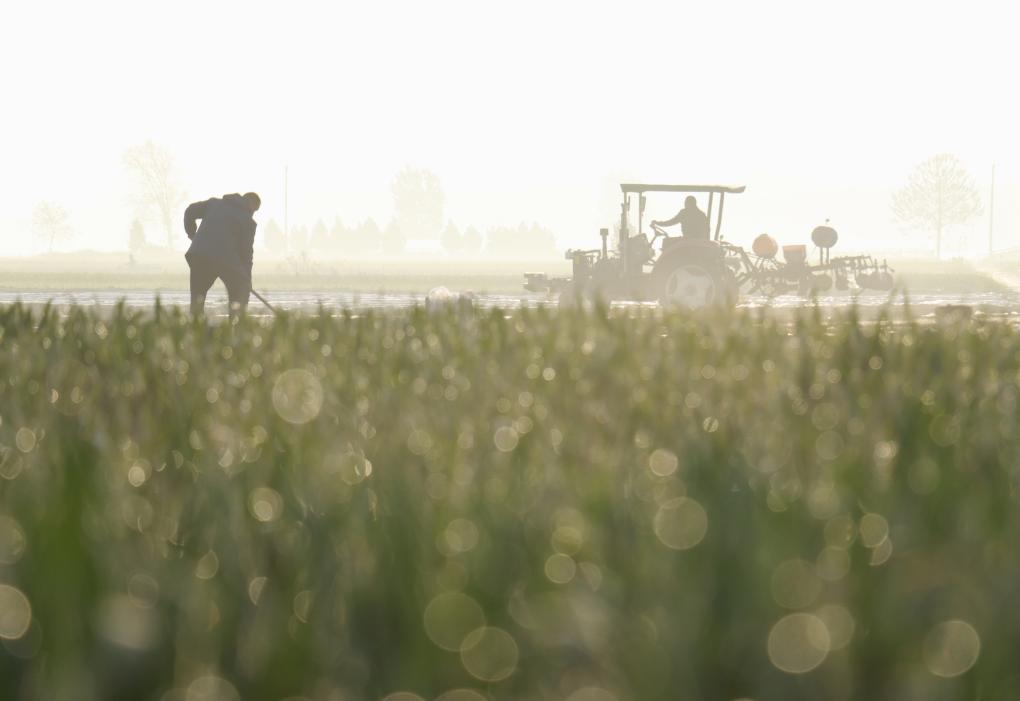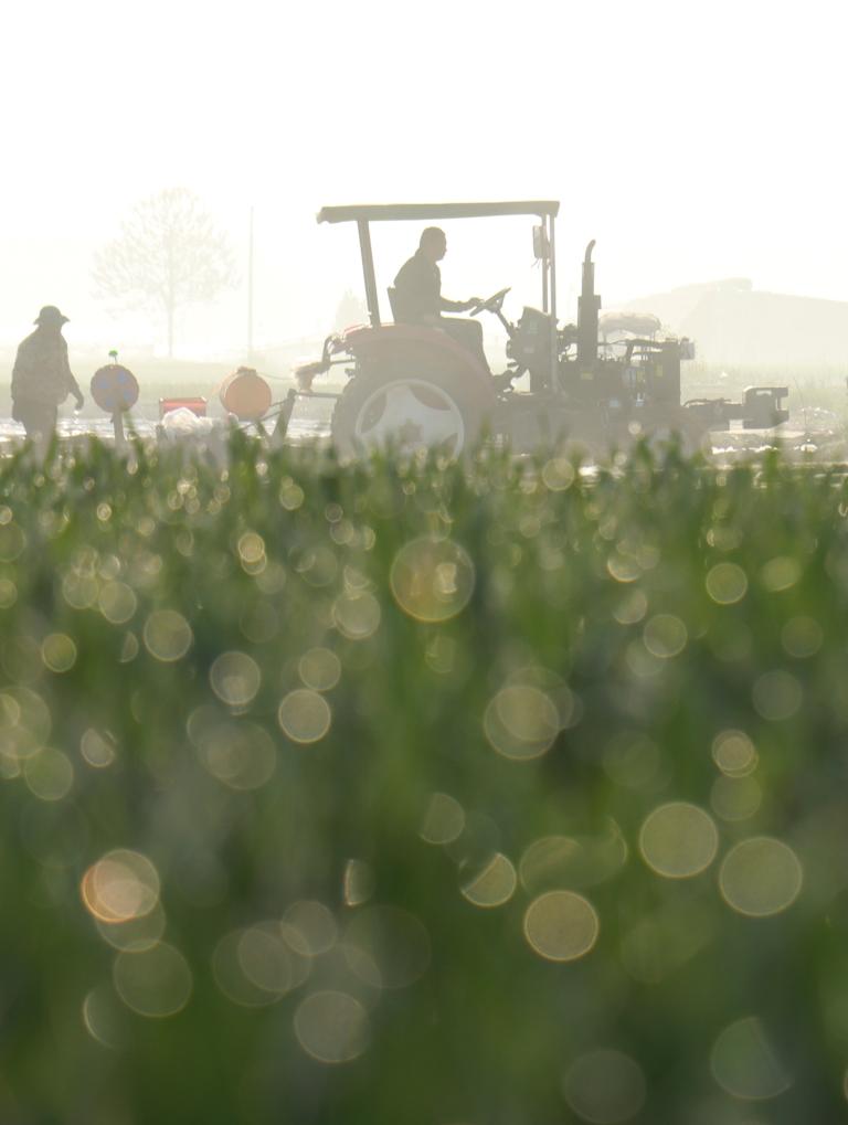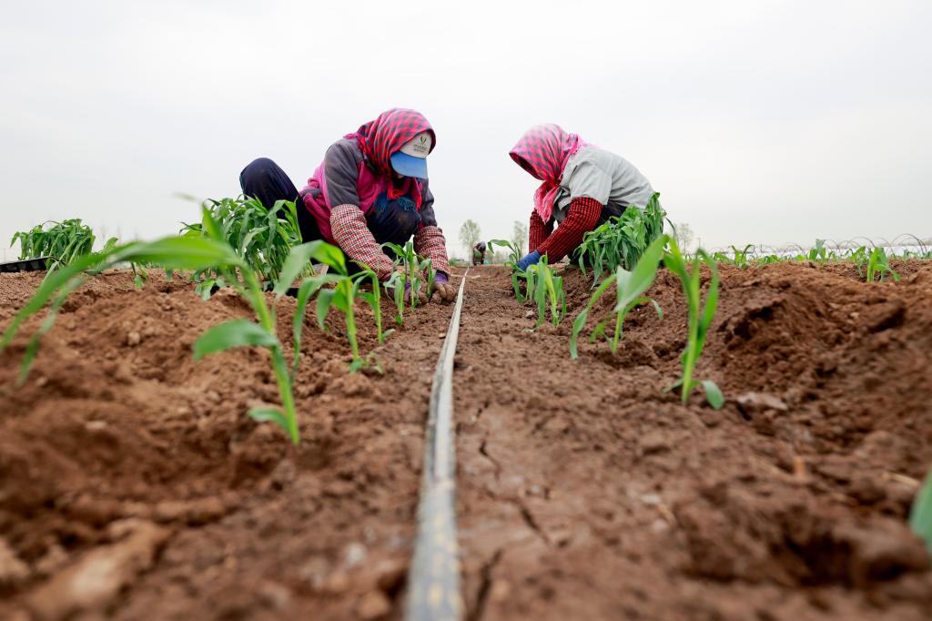 9日、河北省唐山市の畑でスイートコーンの苗を植える農家の人。(唐山=新華社配信/李秀清)
